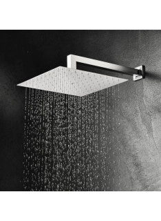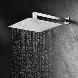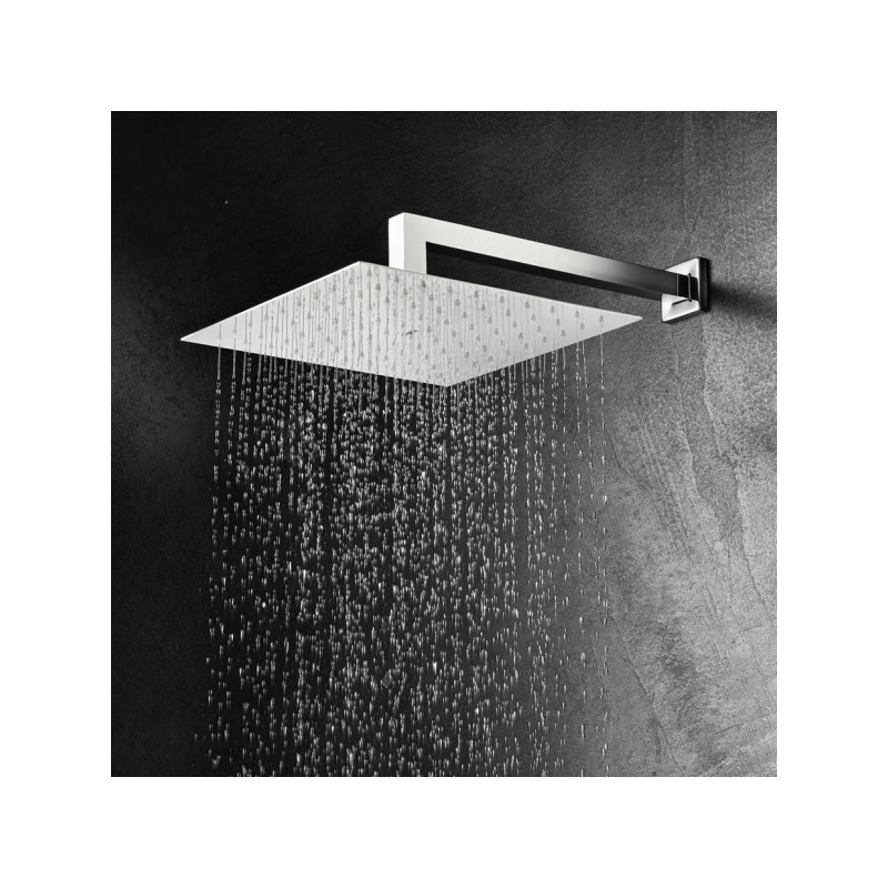 Il s'agit d'une pomme de douche carrée en acier inoxydable avec bras de fixation murale.