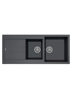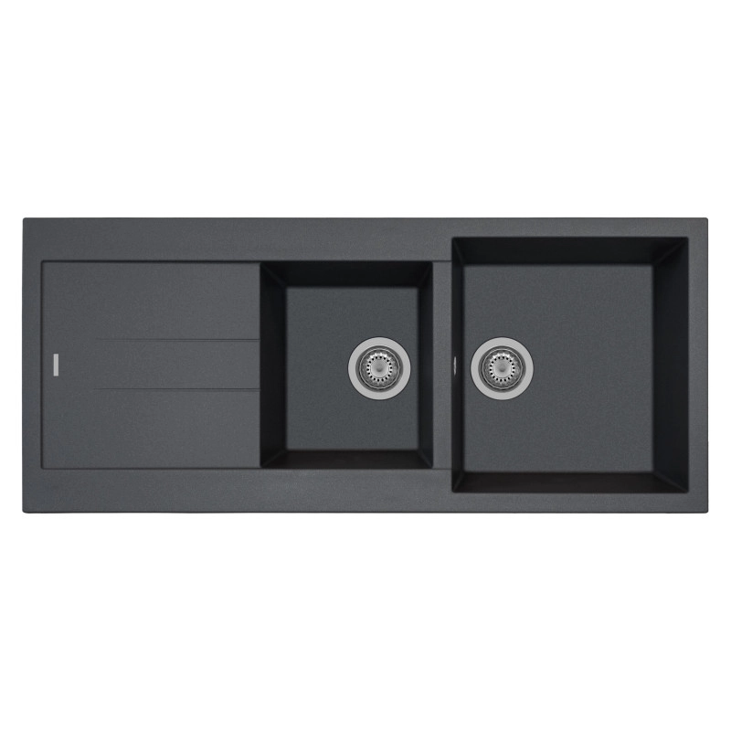 Évier à deux bacs avec bac d'égouttage, réversible, avec trous pré-percés pour l'installation de robinets et accessoires.