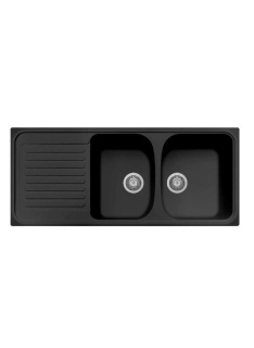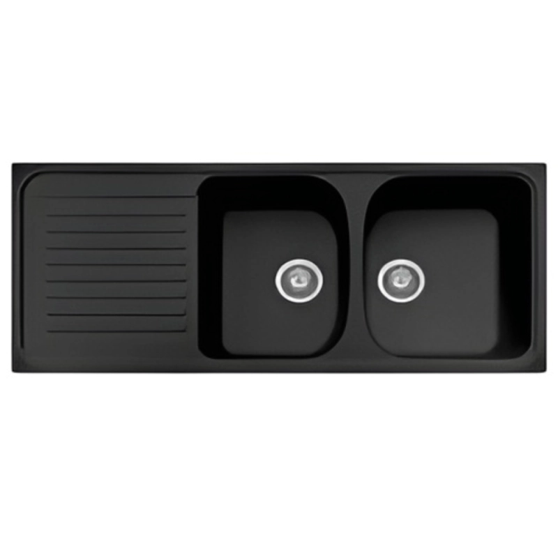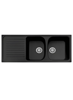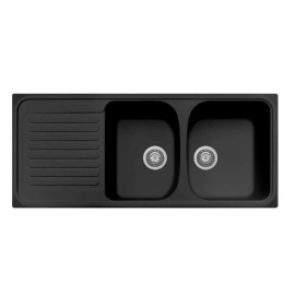 Évier à deux cuves, réversible, avec trous pré-percés pour l’installation de robinets et accessoires.