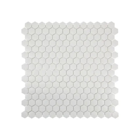 Mosaïque hexagonale blanche assemblée sur filet, idéale pour les piscines, les salle de bains, les hammans, les spas. Originale et facile à poser grâce à sa trame.