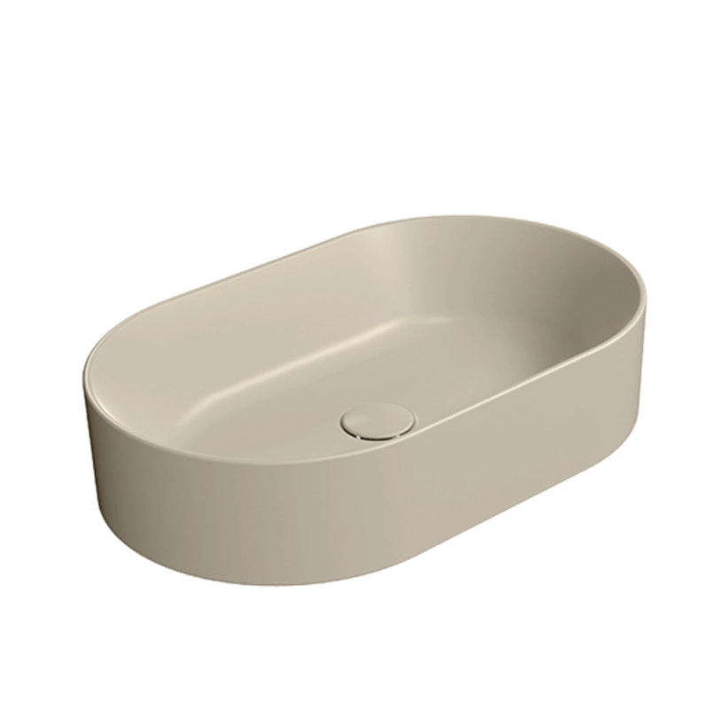 Vasque à poser ovale 60 x 37 cm sans trop-plein. Également disponible dans d'autres finitions GSI Color Eléments, cette vasque peut être équipée d'une bonde chromée ou en céramique.
